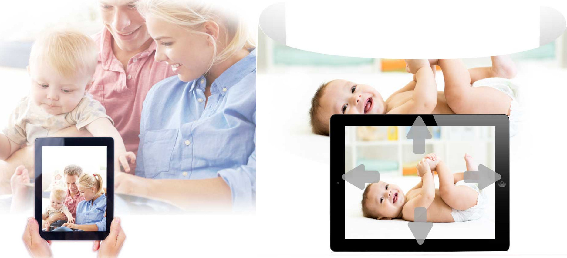 Przesuwając po ekranie swojego urządzenia mobilnego mamy bezpośredni dostęp do podglądu z kamery. Możesz przesuwać iBabi Plus w obszarze 360°.