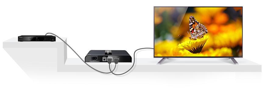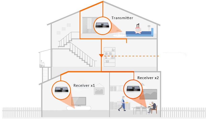 Wystarczy podłączyć nadajnik TX i odbiornik RX do gniazd elektrycznych. Odbiornik TX podłączyć do telewizora HD przewodem HDMI a odbiornik w dowolnym miejscu w domu również przewodem HDMI do drugiego TV. Bez użycia narzędzi oraz wiercenia dodatkowych otworów w ścianach.