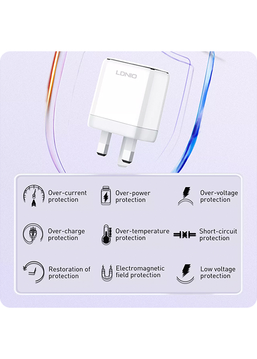 Ładowarka posiada zabezpieczenia chroniące m. in. przed: za dużą mocą, natężeniem i napięciem. Dodatkowo urządzenie jest zabezpieczone przed przegrzaniem i przeładowaniem. Takie systemy gwarantują bezpieczeństwo telefonu podczas ładowania.