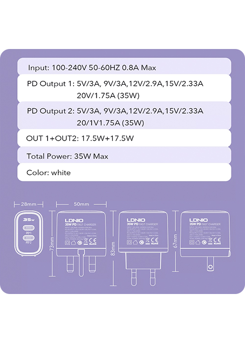 - Wyjście USB-C2 PD: 5V/3A, 9V/3A, 12V/2.9A, 15V/2.33A, 20V/1.75A (35W)