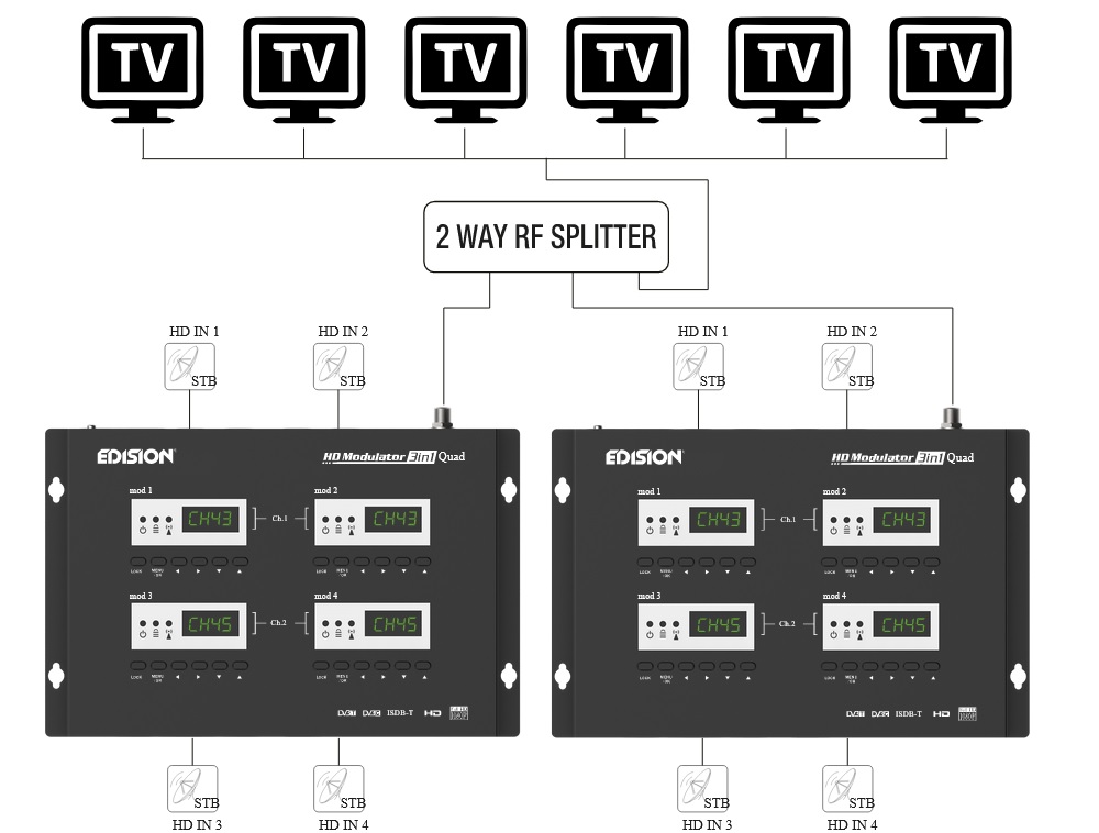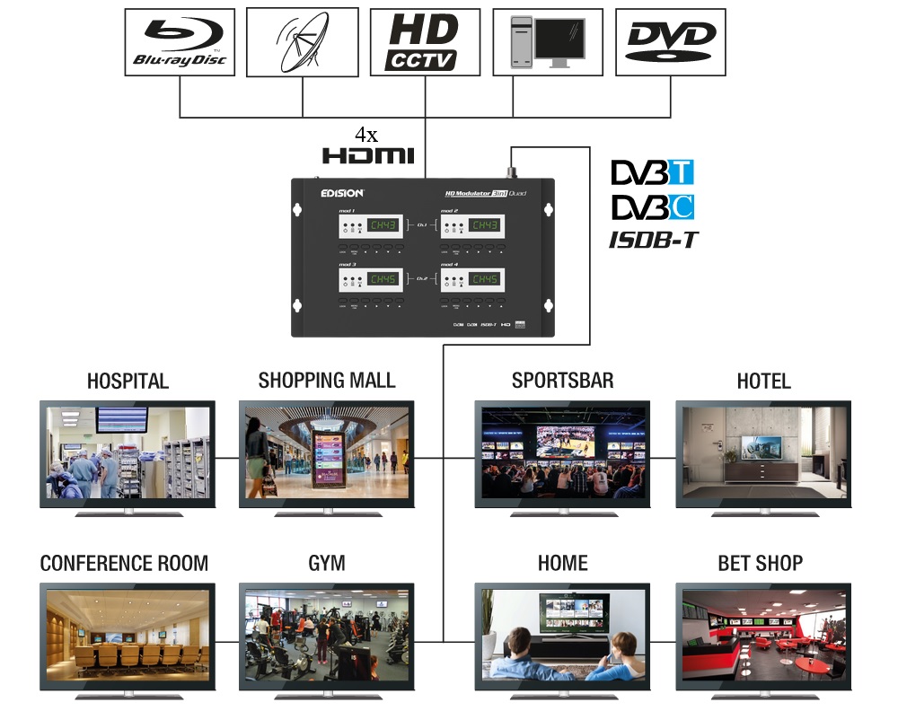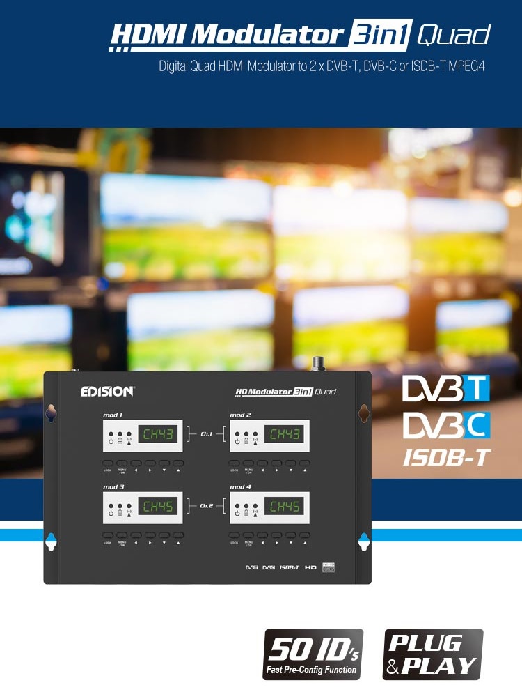 np. z odbiorników satelitarnych, tunerów naziemnych DVB-T2, komputerów PC, notebooków, kamer monitorujących, odtwarzaczy DVD/Blu-ray itp.) na 2x MUX DVB-T, DVB-C lub ISDB-T MPEG4. Cyfrowe sygnały wejściowe HD do 1080p są tutaj w pełni zachowane, kanały wyjściowe RF mogą być bardzo łatwo odbierane przez odbiorniki HDTV lub telewizory z wbudowanym tunerem DVB-T, DVB-C lub ISDB-T MPEG4. Oprócz doskonałej jakości sygnału w połączeniu z niezawodnością, Quad Modulator oferuje łatwą i szybką konfigurację z funkcją Pre-Config, dzięki czemu instalacja jest bardzo szybka PLUG & PLAY!