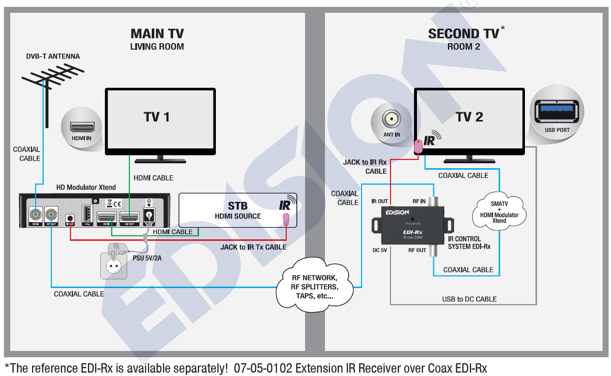Cyfrowy modulator HD XTEND lite z funkcją HDMI loop-through jest niezwykle elastyczny i może konwertować sygnały HDMI (np. z odbiorników satelitarnych, komputerów PC, notebooków, kamer monitorujących, odtwarzaczy DVD / Blu-ray itp.) na DVB-T / MPEG4 . Cyfrowy sygnał wejściowy HD do 1080p jest całkowicie zachowywany, a jednocześnie źródło HDMI jest wyświetlane na głównym telewizorze w czasie rzeczywistym za pomocą funkcji HDMI loop-through. Kanał wyjściowy RF może być bardzo łatwo odebrany przez odbiorniki DVB-T lub telewizory z wbudowanym tunerem DVB-T / MPEG4. Opcjonalnie dostępny jest również system sterowania na podczerwień EDI-Rx, za pomocą którego można bardzo łatwo sterować sygnałem podczerwieni na drugim telewizorze.