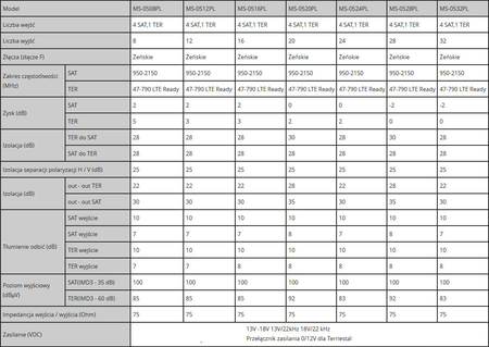 - 4 wyjścia sygnału zsumowanego SAT+DVB-T/T2