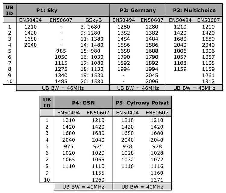 Każde wyjście SCR/Unicable jest konfigurowane indywidualnie tzn. dla każdego z nich użytkownik wybiera z którego satelity chce korzystać (przełącznik zielony, tabela poniżej) oraz częstotliwości Unicable dla dostawcy sygnału (przełącznik niebieski, tabela poniżej):