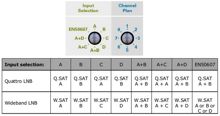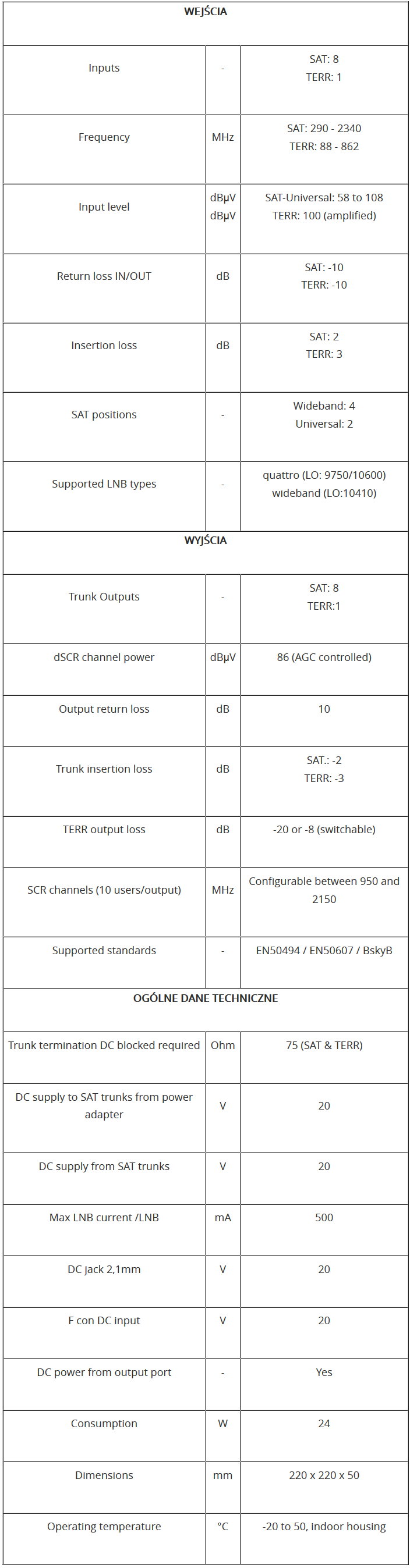 8 wejść satelitarnych (2xQuattro lub 4xWideBand) + 1 wejście DVB-T,