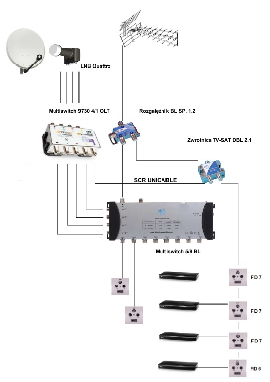 Przykład instalacji z wykorzystaniem Multiswitcha Johannson 9730 - 4/1 Unicable, SCR, OLT