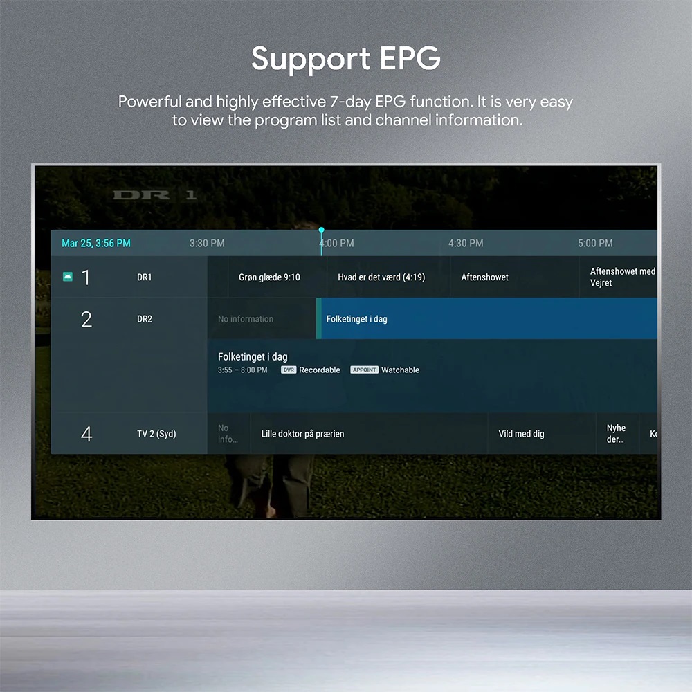 Telewizja - Największą zaletą odbiornika oprócz dostępu do telewizji internetowej (ponad 400000 filmów i seriali) MECOOL KT1 pozwala odbierać telewizję naziemną DVB-T/T2 w nowej kompresji HEVC H.265 oraz kablową DVB-C.