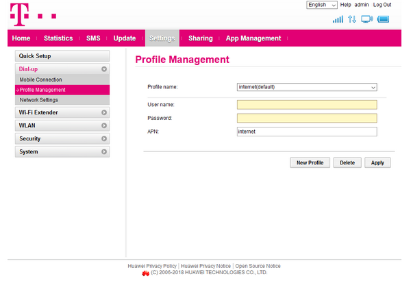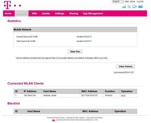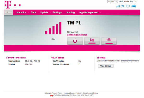 Obsługa routera Huawei jest bardzo prosta i intuicyjna. Wystarczy włożyć kartę SIM do czytnika, uruchomić urządzenie i połączyć się z nim za pomocą Wi-Fi. Dalsze kroki wykonujemy w przeglądarce, urządzenie przeprowadzi nas przez szybką konfigurację. Domyślny login i hasło to admin, które w kolejnych krokach będzie wymagało zmiany. Panel zarządzania jest w języku angielskim.