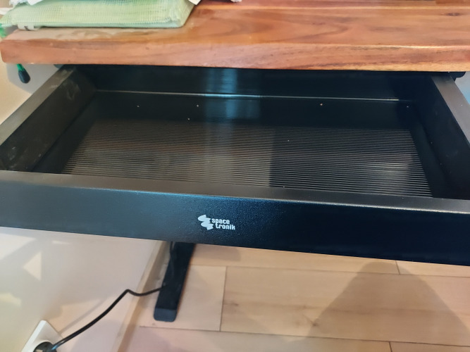 Szuflada została wyposażona w zestaw funkcjonalnych przegródek o różnych rozmiarach, które ułatwiają segregację i przechowywanie codziennych akcesoriów. W centralnej części znajdują się trzy mniejsze komory idealne na długopisy, markery czy spinacze. Po bokach, większe przestrzenie na notatniki, ładowarki, kable lub powerbank. Wszystko ma swoje miejsce, co pozwala utrzymać porządek bez szukania „czegokolwiek do pisania” w środku spotkania.