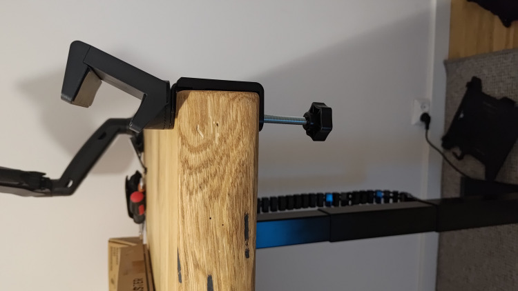 Uchwyt nie ma problemu nawet z listwą o parę mm szerszą, trzyma ją mocno. Jedyny minus jest taki, że wymaga dodatkowego odsunięcia biurka, do którego jest przymocowany, od ściany, żeby nie rysować jej podczas zmiany wysokości.