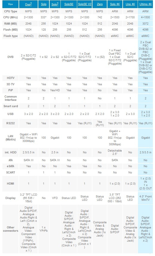Poniżej znajduje się porównanie Vu+ Uno 4K z innymi modelami Vu+