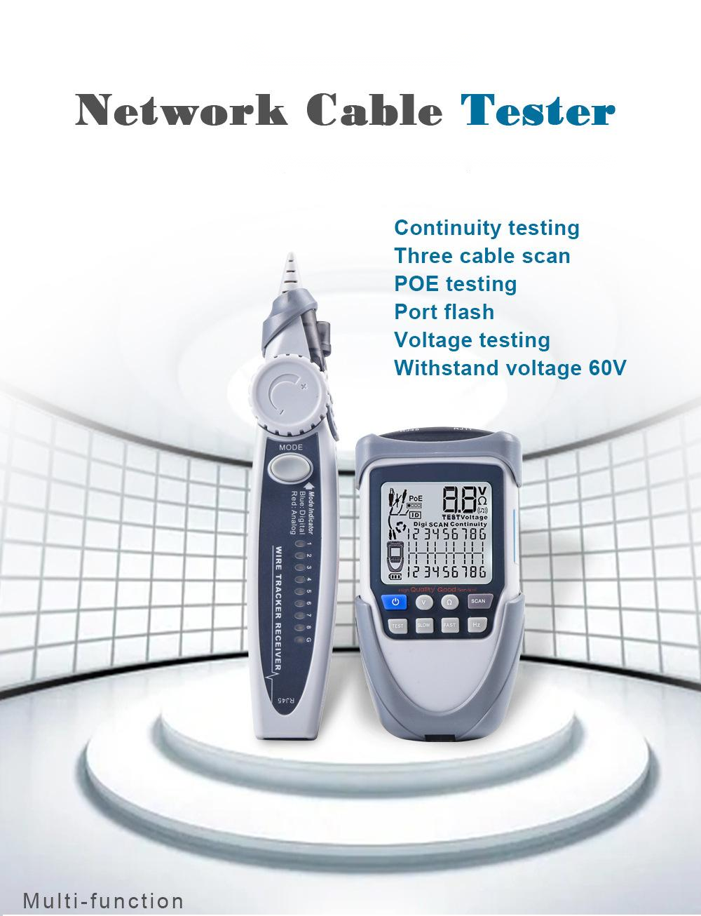 Ten tester kabli ma funkcję śledzenia analogowego, mapowania kabli, pomiaru napięcia PoE, regulacji czułości śledzenia cyfrowego itp. Miernik jest wyposażony w duzy czytelny ekran LCD, powiadomienia vibracyjne, oraz światło LED poprawiające znaczaco komfort pracy.