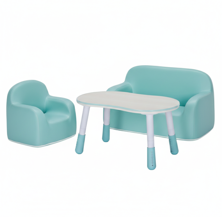 Pokój dziecięcy potrafi być prawdziwym poligonem doświadczalnym dla mebli. Dlatego w tym zestawie liczy się praktyczność: łatwe czyszczenie, miękkie formy, zaokrąglone krawędzie i mobilność. Stolik rośnie razem z dzieckiem dzięki regulacji wysokości, a sofa i fotelik zapewniają wygodny kącik relaksu oraz bezpieczną strefę zabawy, którą dziecko może łatwo przestawiać w zależności od pomysłu na dzień.