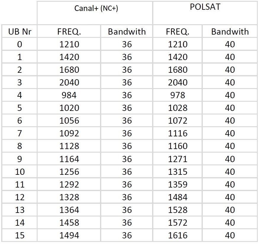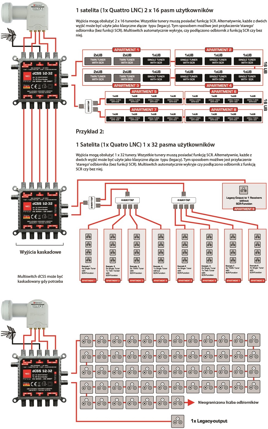 (Multiswitch dCSS posiada dwa wyjścia po 16 pasm użytkownika User Bands (możliwość programowania dowolna, jedno wyjście np. Canal+ drugie Polsat lub oba pod Canal+ lub Polsat)