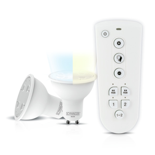 Nowoczesna zestaw żarówek LED firmy SCHWAIGER z technologią ZigBee tworzy niezwykłą atmosfere w pokoju ze względu na różne jasne kolory a także regulowane natężenie światła i temperature światła. Żarówke można po prostu wkręcić w standardowe gniazdo GU10. Jest łatwo integrowana z siecią HOME4YOU i może być obsługiwane za pomocą aplikacji SCHWAIGER HOME lub za pomocą pilota zdalnego sterowania ZHF02.